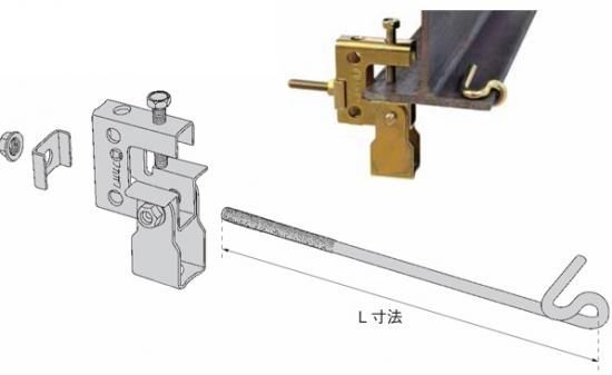 天井から梁状に延びている一般鋼材(C 型チャンネル・アングル・デッキプレート・I 形鋼・みぞ形鋼・H 形鋼)等に固定し、ダクト類を吊るための全ネジを下げる金具です。